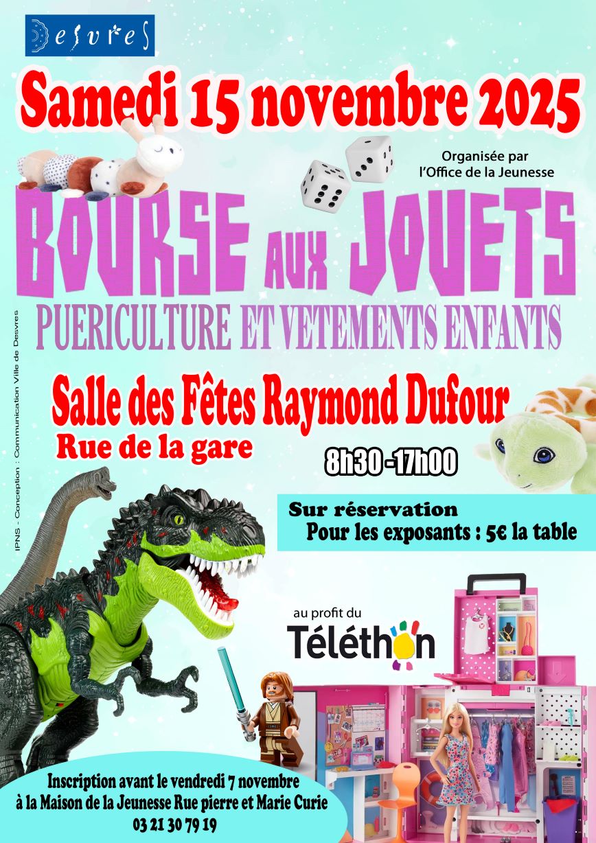 Comme chaque année, l’Office de la Jeunesse organisera sa bourse aux jouets, aux vêtements enfants et au matériel de puériculture le samedi 15 novembre prochain à la salle des fêtes R.Dufour, rue de la Gare. Et tout cela au profit du Téléthon.