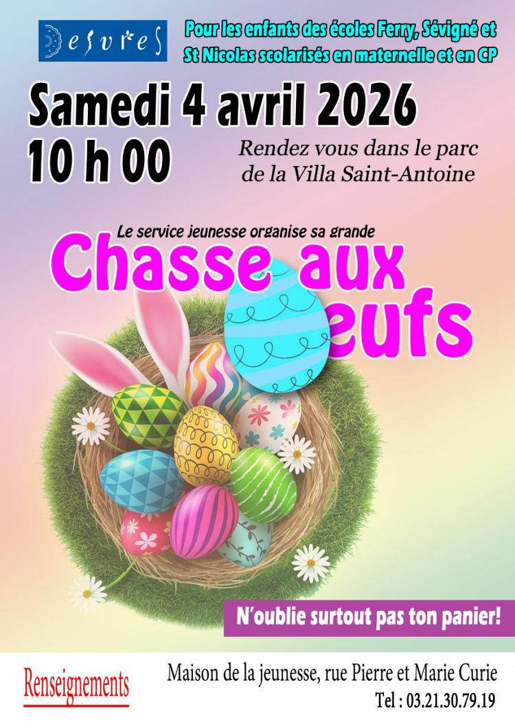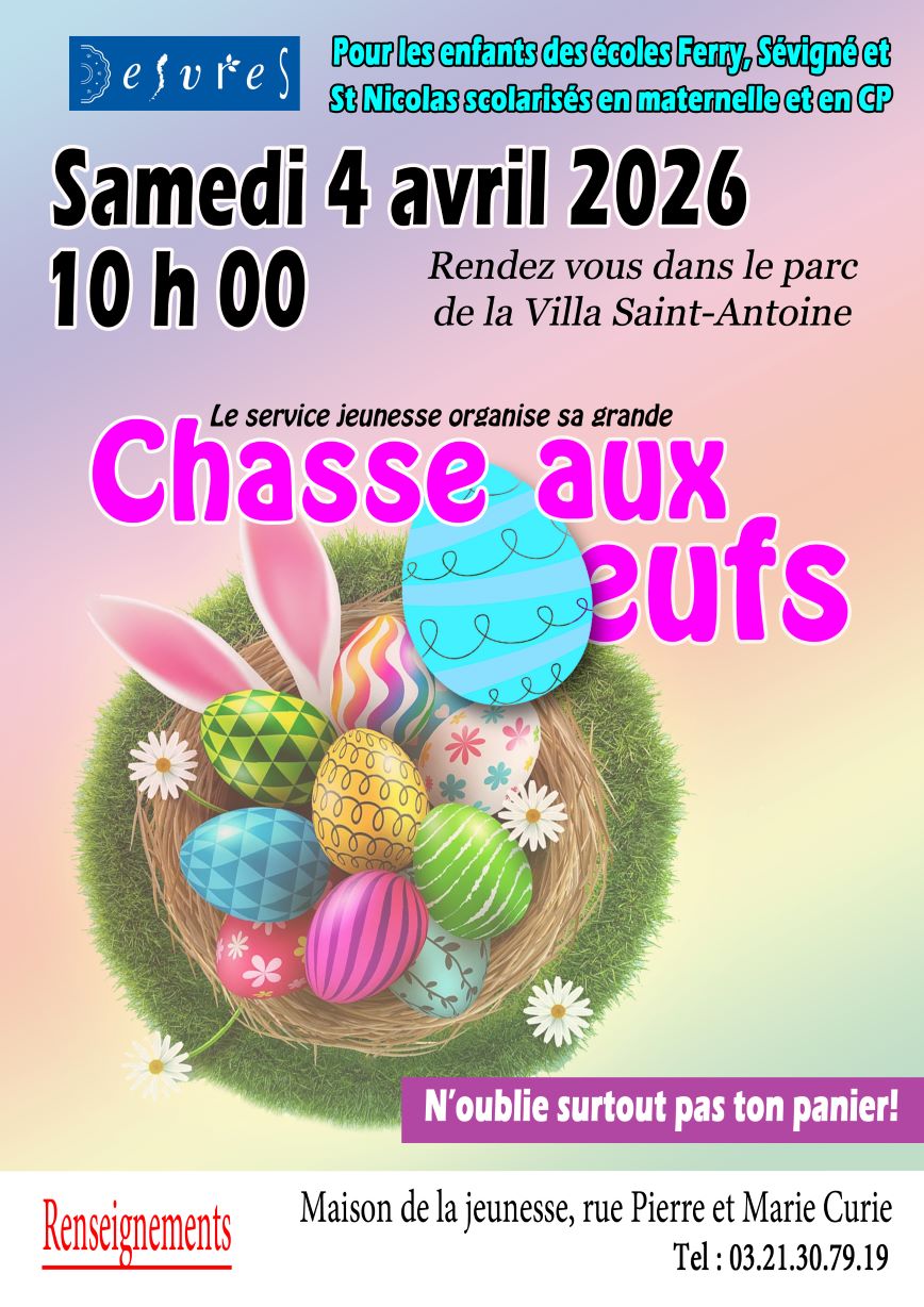 A l’occasion de Pâques, le service jeunesse de la commune propose une grande chasse aux œufs réservée aux enfants des écoles ferry, Sévigné et Saint Nicolas scolarisés en maternelle et en CP. Rendez-vous le samedi 4 avril à 10h00 dans le parc de la Villa Saint-Antoine, rue du Onze Novembre.