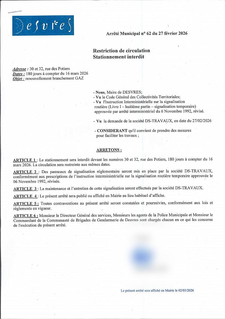 Dans le cadre d’un renouvellement de branchement de gaz, le stationnement sera interdit devant les numéros 30 et 32 de la rue des Potiers durant une période de 180 jours à compter du lundi 16 mars. La circulation sera également restreinte aux mêmes dates.