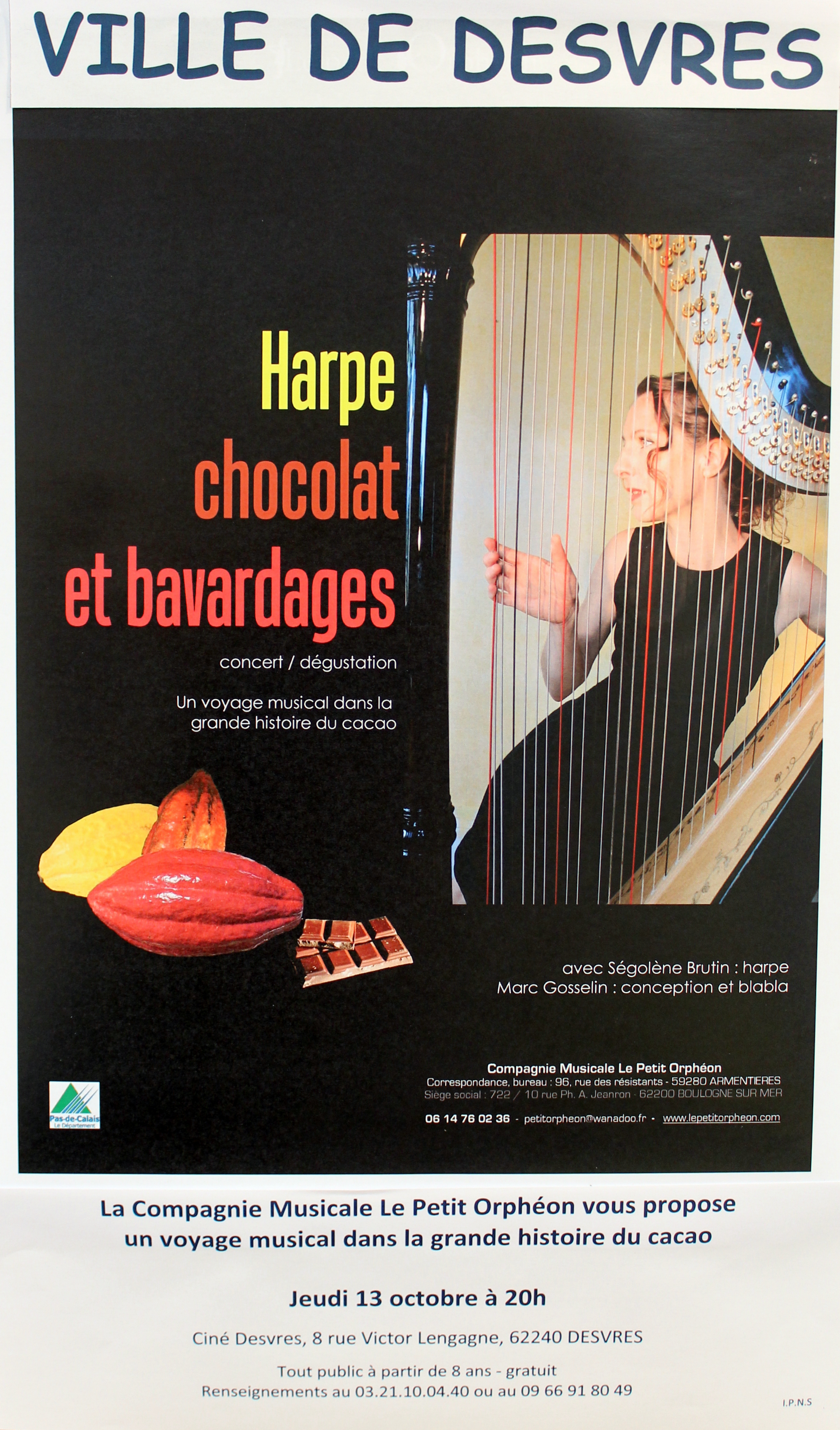 La Médiathèque et L’office de la culture vous proposent un concert-dégustation nommé : "Harpe, chocolat et bavardage" par la compagnie musicale : Le petit Orphéon, sur le thème "voyage musical dans la grande histoire du Cacao".