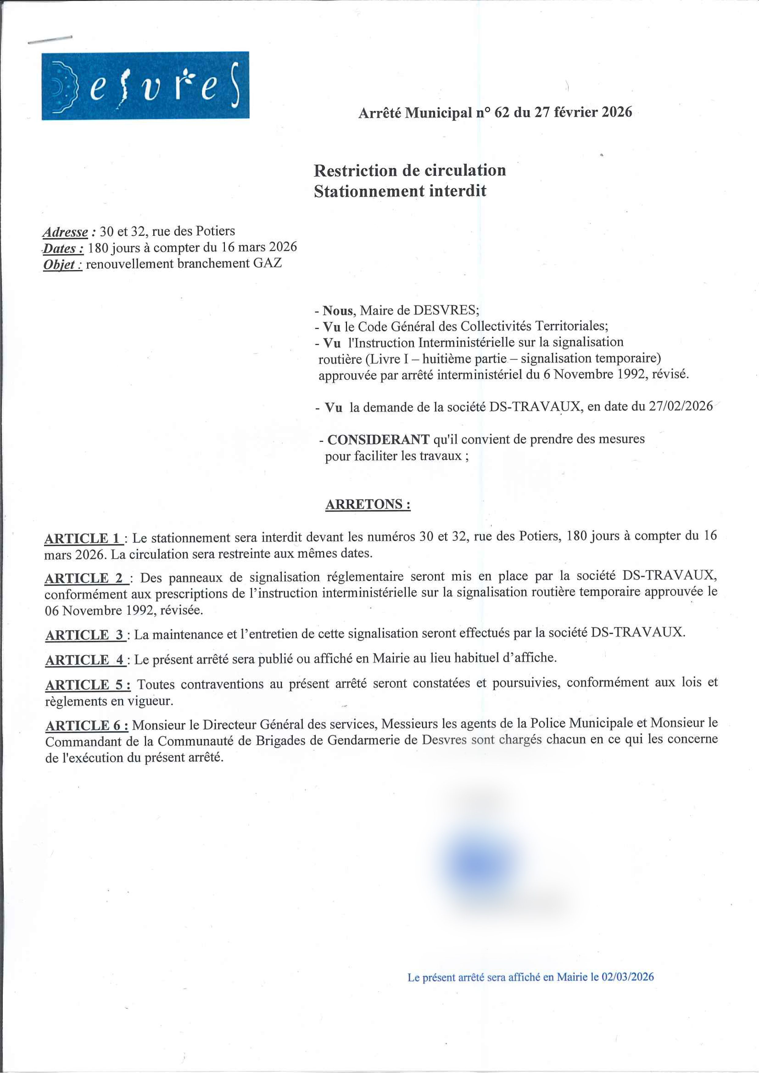 Dans le cadre d’un renouvellement de branchement de gaz, le stationnement sera interdit devant les numéros 30 et 32 de la rue des Potiers durant une période de 180 jours à compter du lundi 16 mars. La circulation sera également restreinte aux mêmes dates.